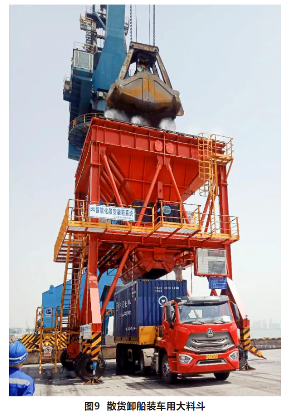 每个口岸都有各类各样的散货卸船卸车用大料斗。散货卸船卸车用大料斗见图9。有的口岸企业还将智能节制、抑尘、计量等新手艺立异集成使用于大料斗。