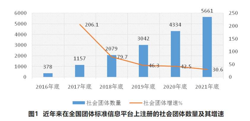 我国集体尺度相关政策一经发布,立即惹起全社会普遍关心,尺度化需求得以充实。按照全国集体尺度消息平台的统计数据,截至2021岁尾,正在该平台上注册的社会合体达5 661个。近年来正在全国集体尺度消息平台上注册的社会合体数量及其增速见图1。从图1能够看出,近年来虽然正在该平台上注册的社会合体增速有所放缓,但仍达到30%的增速。正在所有的注册社会合体中既有雷同中国机械工业结合会、中国口岸协会等某个行业范畴的组织机构,同时也有雷同济南市章丘区铁匠手工艺行业协会、长垣县起沉配备制制行业协会、无锡市口岸起沉机械行业商会等地区性行业协会、商会。