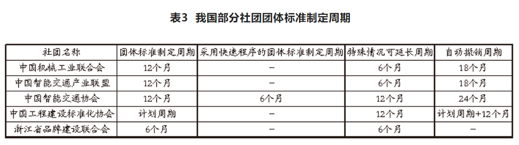 通过调研国内十余个国度级、省级集体尺度制定机构后发觉,目前集体尺度制定周期遍及正在6~12个月,最短的3~6个月,采用快速法式制定的尺度不跨越6个月。国度级社会合体的尺度制定周期一般不跨越12月。我国部门集体尺度制定周期见表3。