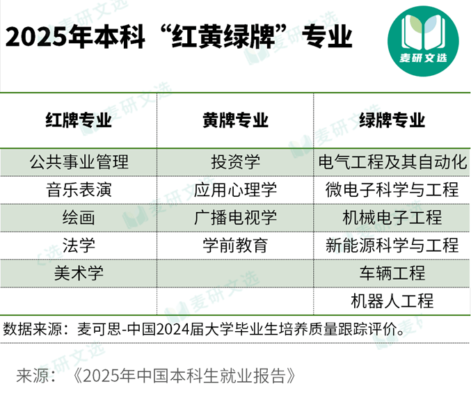 近日,麦可思研究院发布《2025年中国本科生就业演讲》,基于2024届结业生就业落实率、薪资程度、就业对劲度及国度计谋需求等多项目标,发布了2025年本科红、黄、绿牌专业名单,为2026届考生供给参考