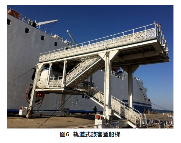国内已有多种邮汽船埠和客滚船埠搭客上下船的简略单纯搭客登船梯,以至还有良多邮汽船埠配备了奢华登船桥设备。轨道式搭客登船梯见图6。
