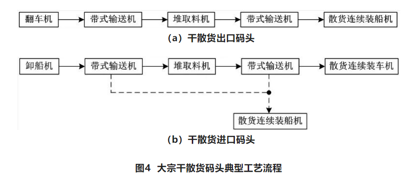 取从动化集拆箱船埠比拟,从动化干散货船埠(次要指煤炭和矿石船埠)工艺更复杂,设备类型更多,同时船埠的节能环保相关要求更高。大干散货船埠典型工艺流程见图4。图4(a)为干散货出口船埠典型工艺流程图,我国基于“西煤东运”“北煤南运”的北方大量煤炭船埠均采用该工艺流程。正在该工艺流程中,翻车机和带式输送机系统早已实现了从动化运转,所以目前从动化扶植和工做次要环绕堆取料机(包罗堆料机、斗轮取料机和斗轮堆取料机等3种设备)和持续拆船机展开。图4(b)为干散货进口船埠典型工艺流程图,我国大量矿石进口船埠和基于“北煤南运”的南方煤炭进口船埠采用该工艺流程。正在该工艺流程中,除了堆取料机外,从动化扶植和工做次要环绕卸船机和散货持续卸车机,抓斗门座起沉机等断续工做制卸船机械和链斗式卸船机、螺旋式卸船机等持续卸船机械。部门进口船埠(例如烟台港西港区矿石船埠)还具有转水功能,干散货卸船后间接转水拆船或从堆场取料拆船,因而拆船机的从动化也是工做沉点。