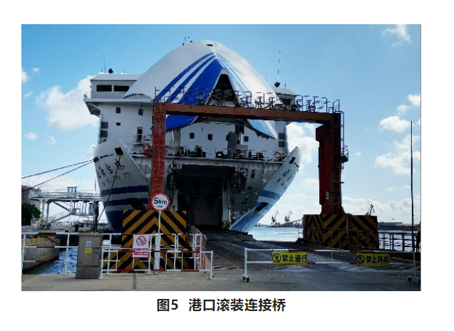 我国各口岸已有近百台套可供汽车上下船的口岸滚拆毗连桥,遍及烟台港、威海港、蓬莱港、长岛港、大连港、海口港、徐闻港、厦门港等的各个跨海和陆岛客滚运输船埠。口岸滚拆毗连桥见图5。