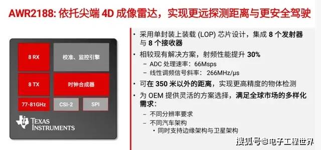 单芯片4D雷达TI一曲是领跑者,AWR2188是业界首个单芯片8发8收的方案,支撑卫星式架构取边缘式架构,同时具备加强型模数转换器数据处置功能取雷达线性调频信号斜率引擎,其机能较现有处理方案提拔了30%。按照TI的引见,AWR2188对距离 350m 的方针物体也能实现高精度探测,全方位提拔驾驶的平安性取从动驾驶程度。