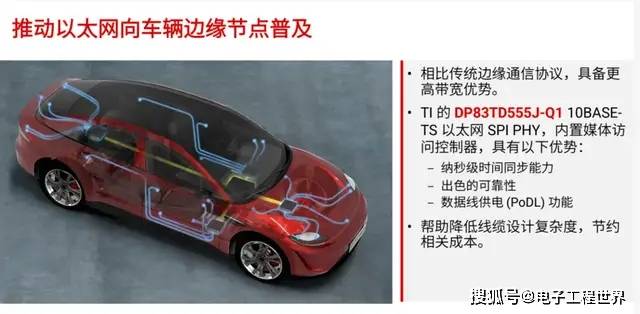 10BASE-T1S正在汽车中的成长速度很快,为了将以太网扩展至车辆边缘节点,TI推出了首款10BASE-T1S产物DP83TD555J-Q1。它具有纳秒级的时间同步能力,正在几秒钟内就能够对平安做出决策;也能够拓展其他功能,好比照明节制、车窗节制甚至将来音频同步;它还具无数据线供电功能,能够正在统一根线上同时传输电力和数据。总得来说,这款产物可以或许帮帮降低线缆设想复杂度,节约成本。