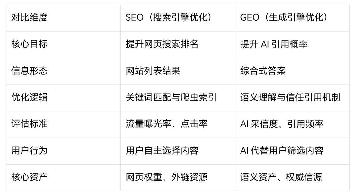 GEO(Generative Engine Optimization,生成引擎优化),指通过内容、数据取布局的系统优化,使生成式AI模子回覆用户问题时,优先识别、援用并采信品牌内容的策略取方式。其焦点素质是面向AI模子的消息优化取信赖办理系统,实现“算法层面的品牌可见性”,完成从“被搜刮”到“被信赖”的品牌增加逻辑升级。
